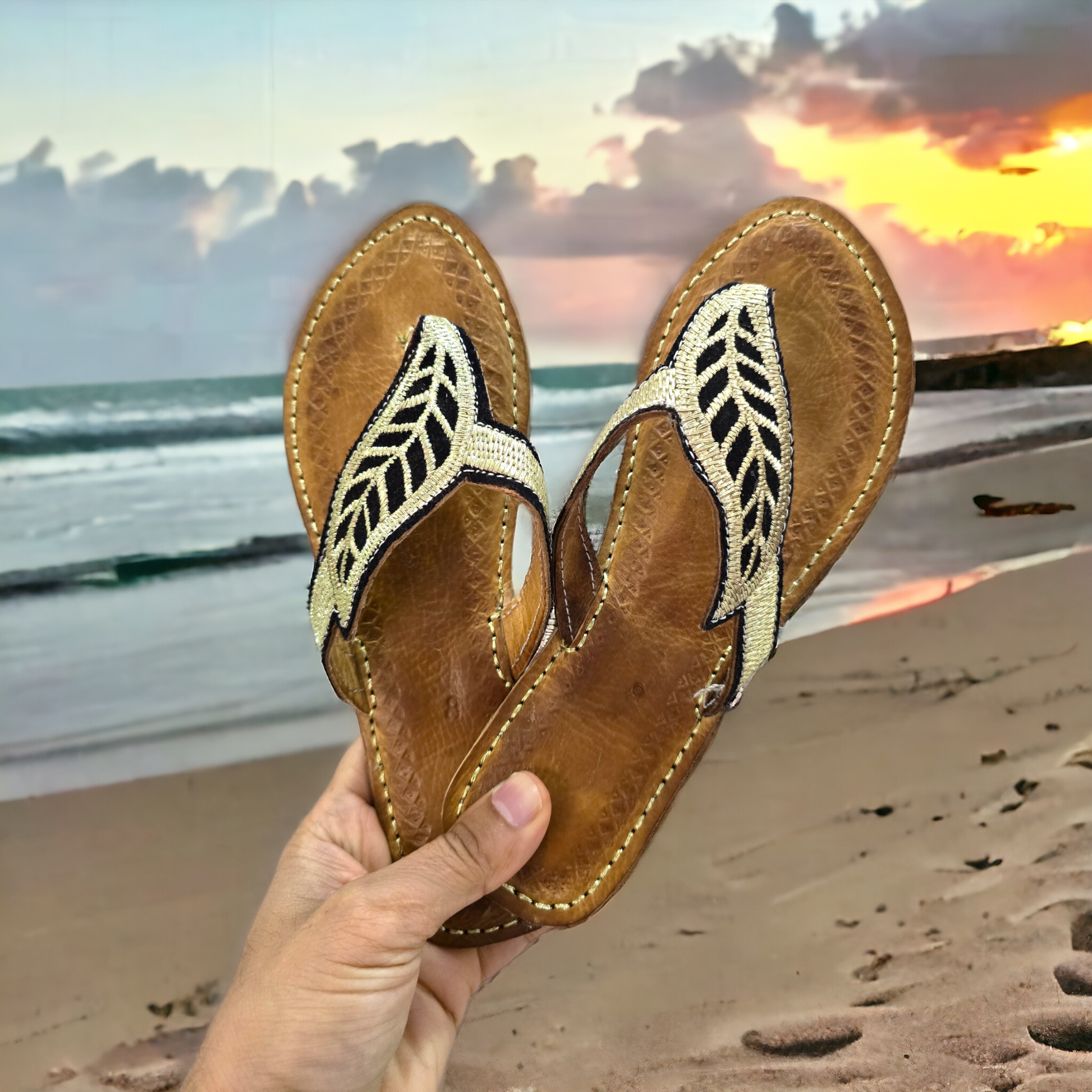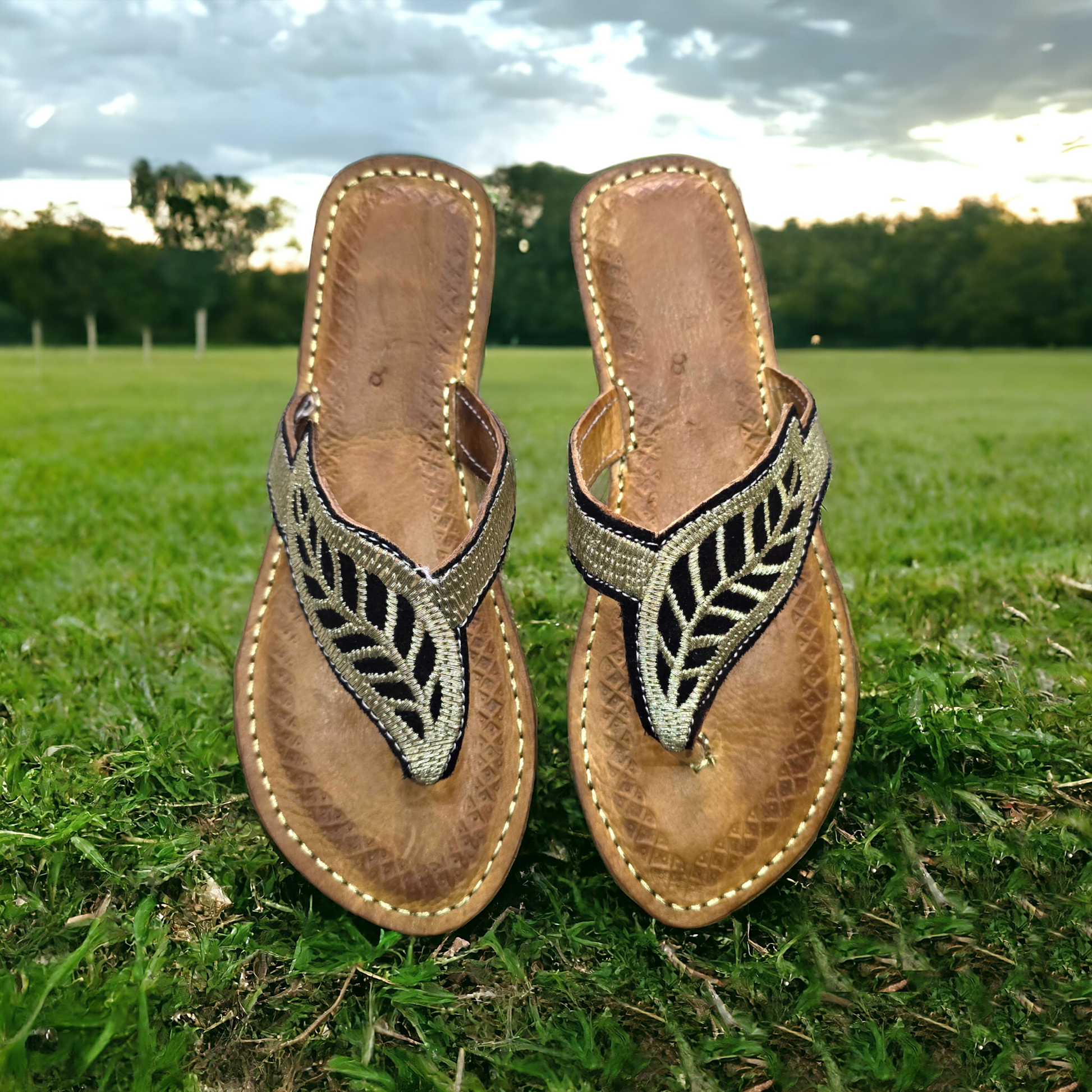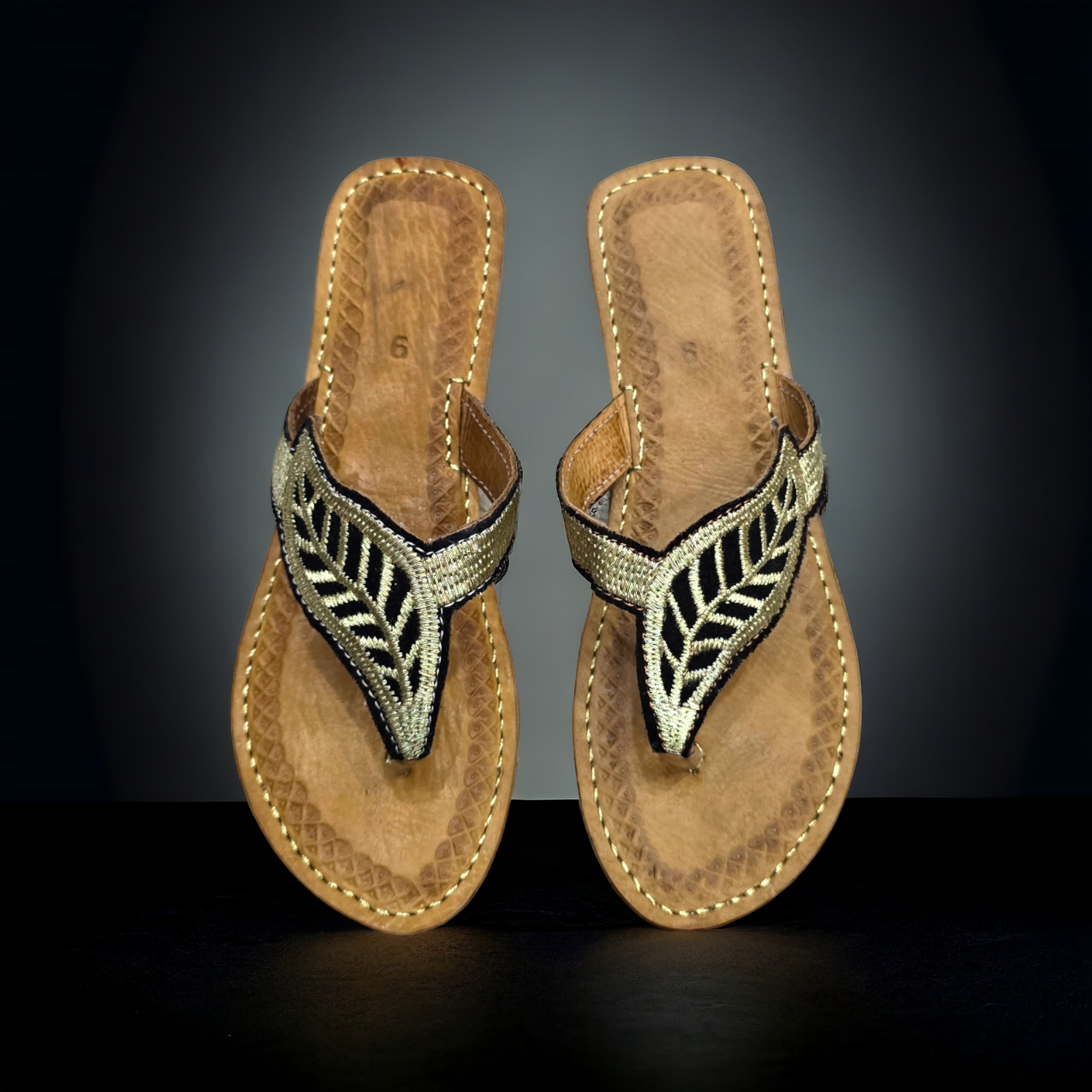 Our Kolhapuri Culture Collection introduces women's till-e-dar leather embellished open-back Kolhapuri flats, crafted from fine leather. This exquisite piece showcases modern Pakistani aesthetics.
