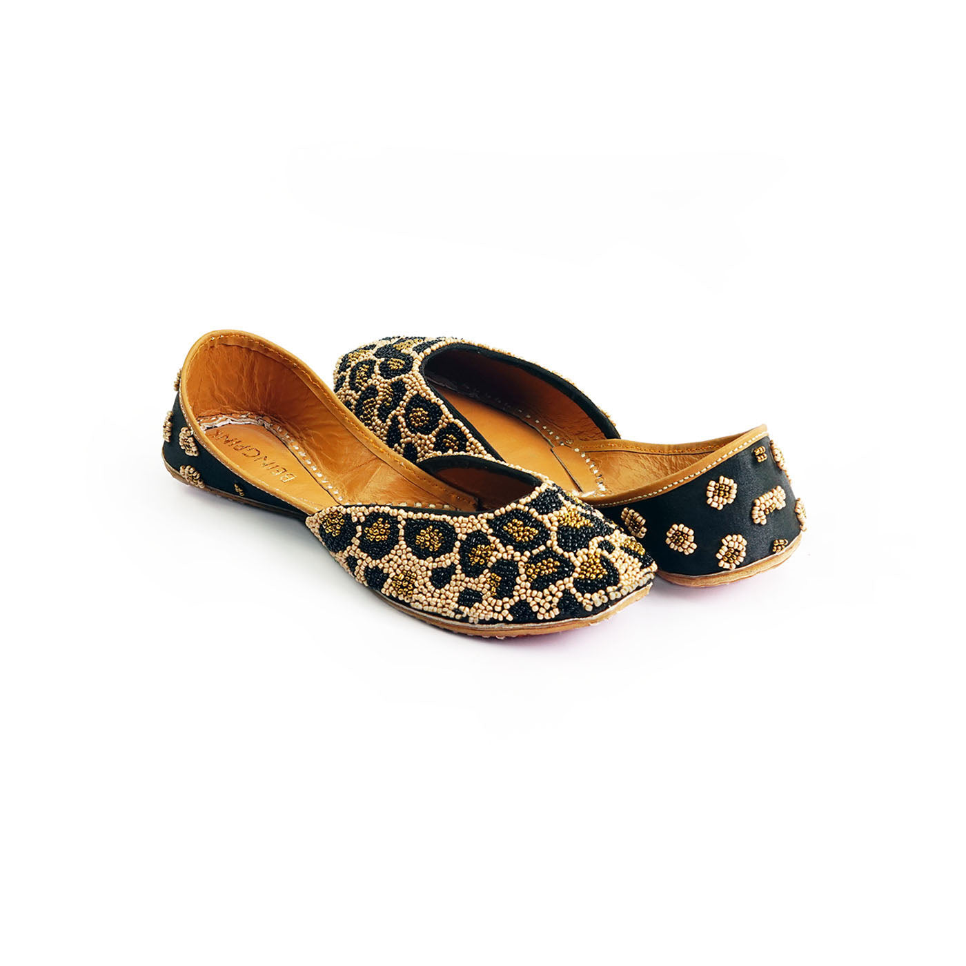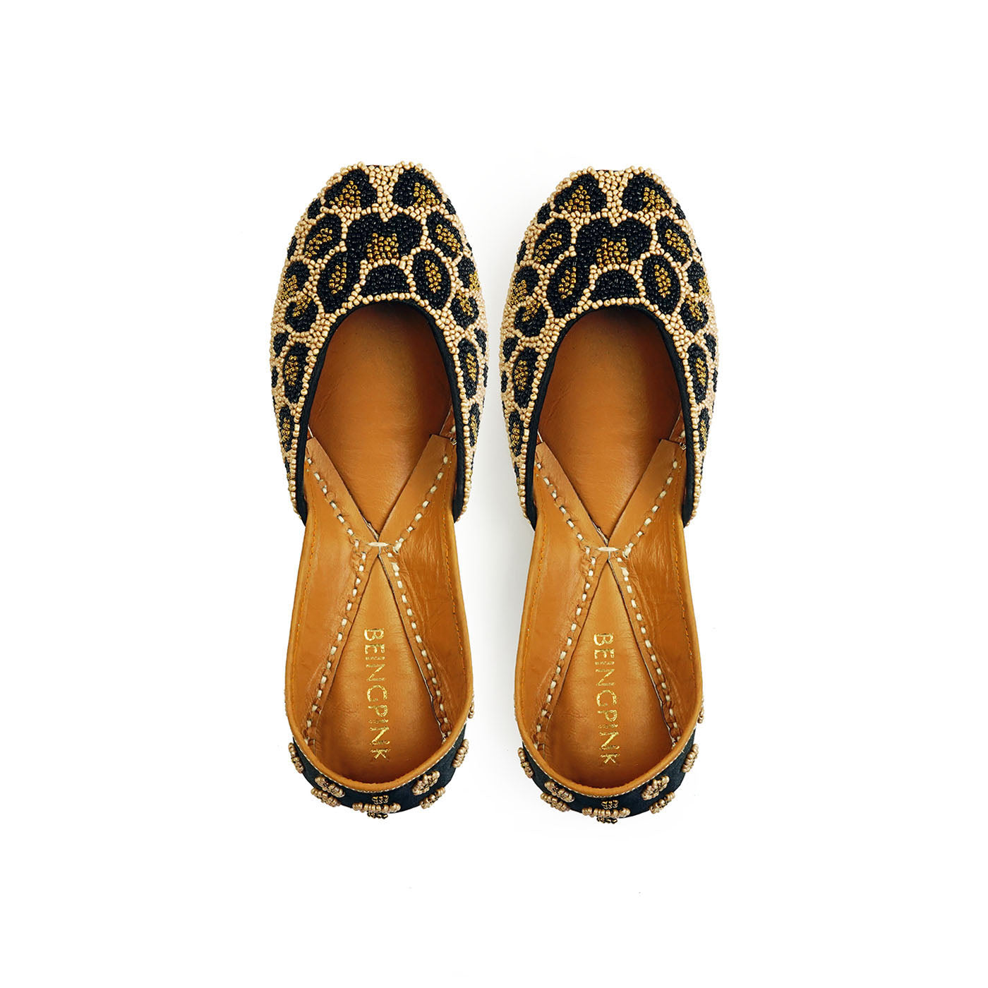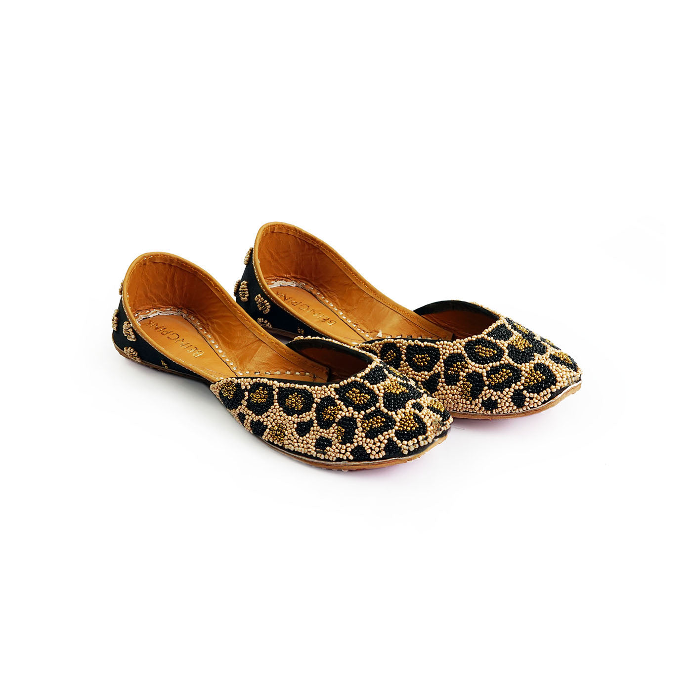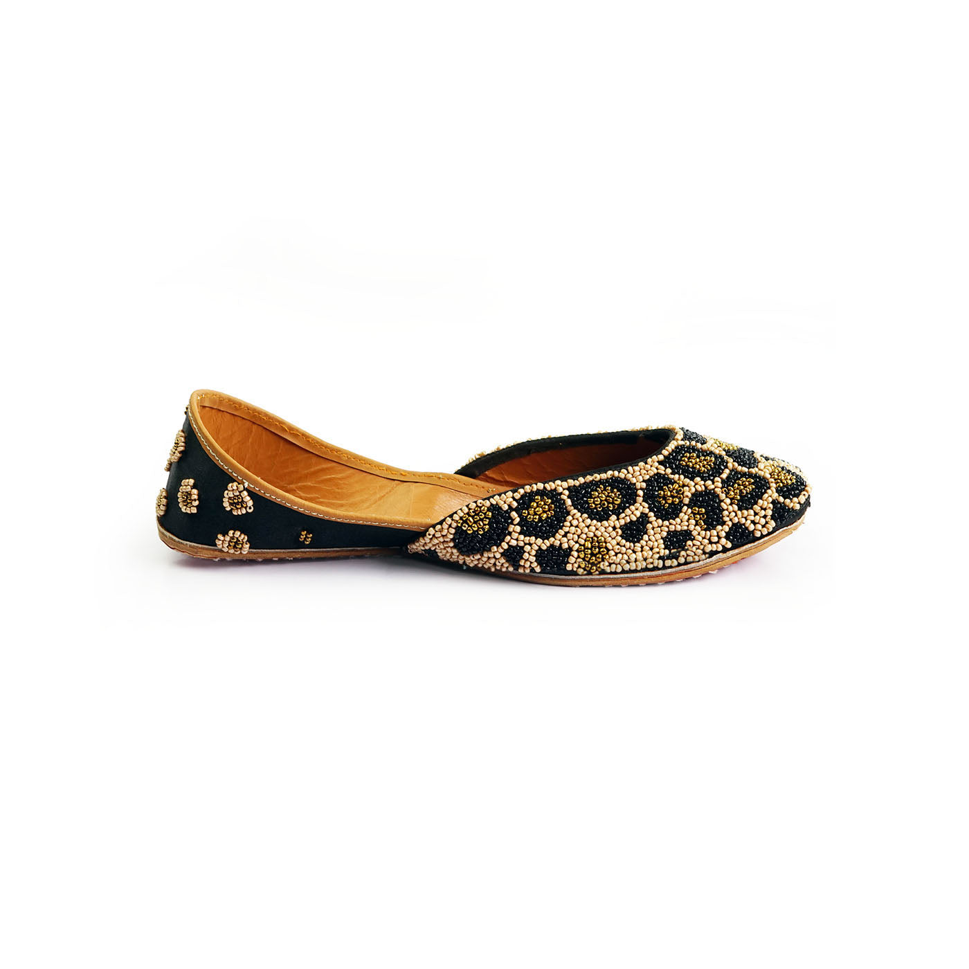 Leopard beaded pattern, carefully embroidered by skilled artisans on silk fabric. Outsole is made of Cow hide. In-socks and inner linings are finished with goat leather. With soft inner padding, Comfortable and Durable.