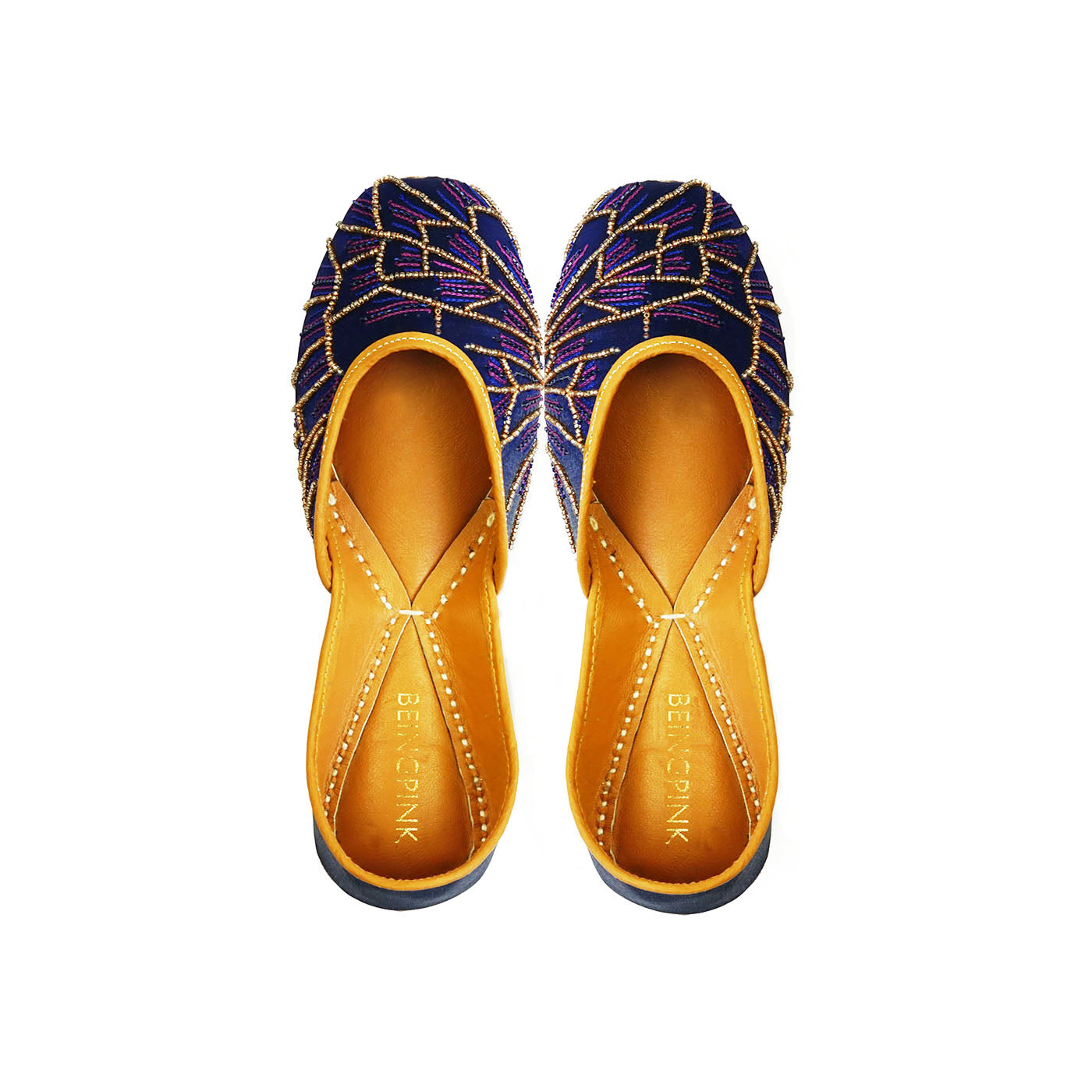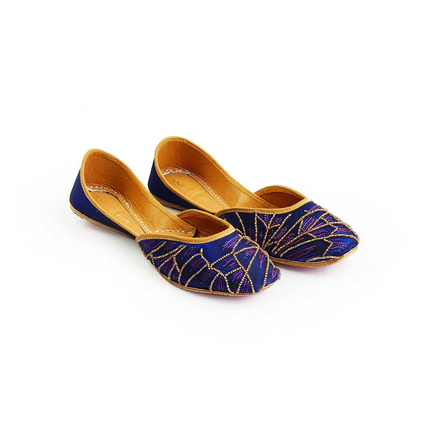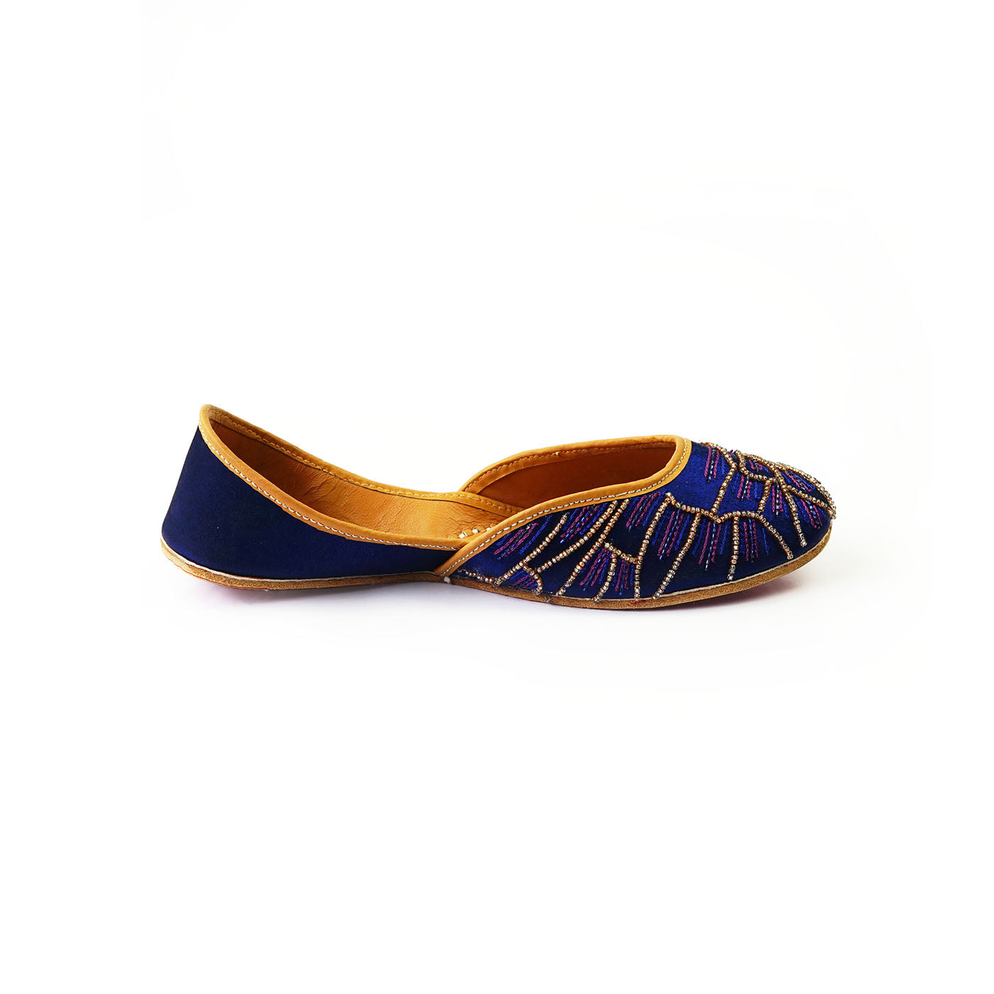Hand Embroidered with Silk threads and tiny golden beads on Moonlight fabric. Outsole is made of Cow hide. In sock and inner linings are finished with real goat leather. With soft inner padding, Comfortable and Durable.