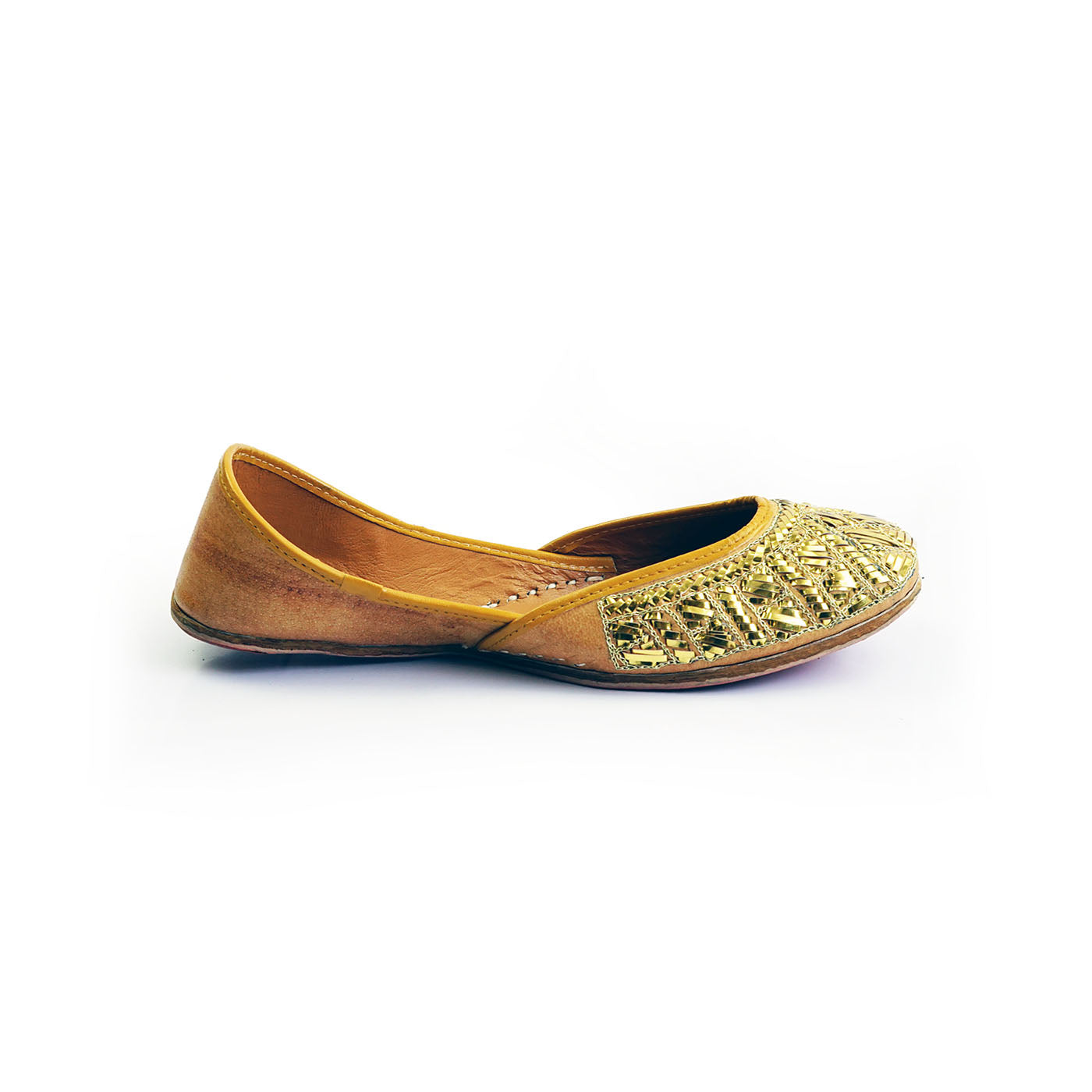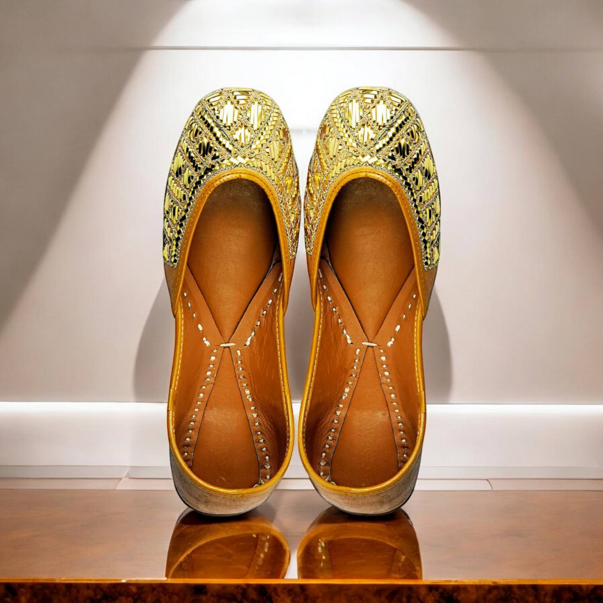 Our exquisite mustard leather mukaish work Jutti, crafted from the finest pure leather. This exceptional creation is part of our best collection, embodying the essence of modern Pakistani aesthetics reflecting the rich heritage of our craftsmanship.