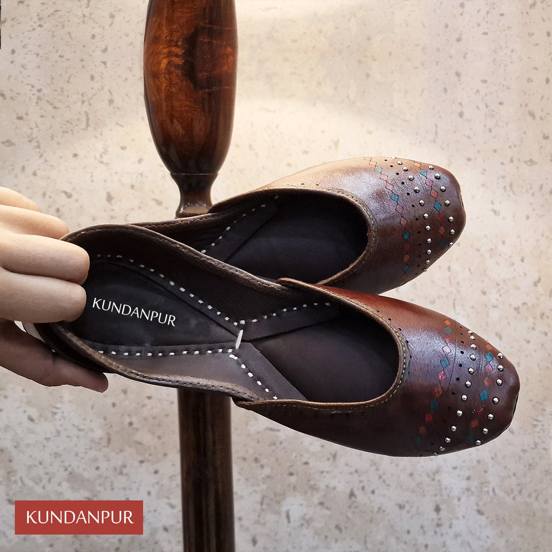 These exquisitely crafted juttis feature a unique tribal-inspired color palette and design. The outsole is constructed from cowhide, while the sock and inner linings utilize synthetic leather. Soft inner padding ensures both comfort and durability.